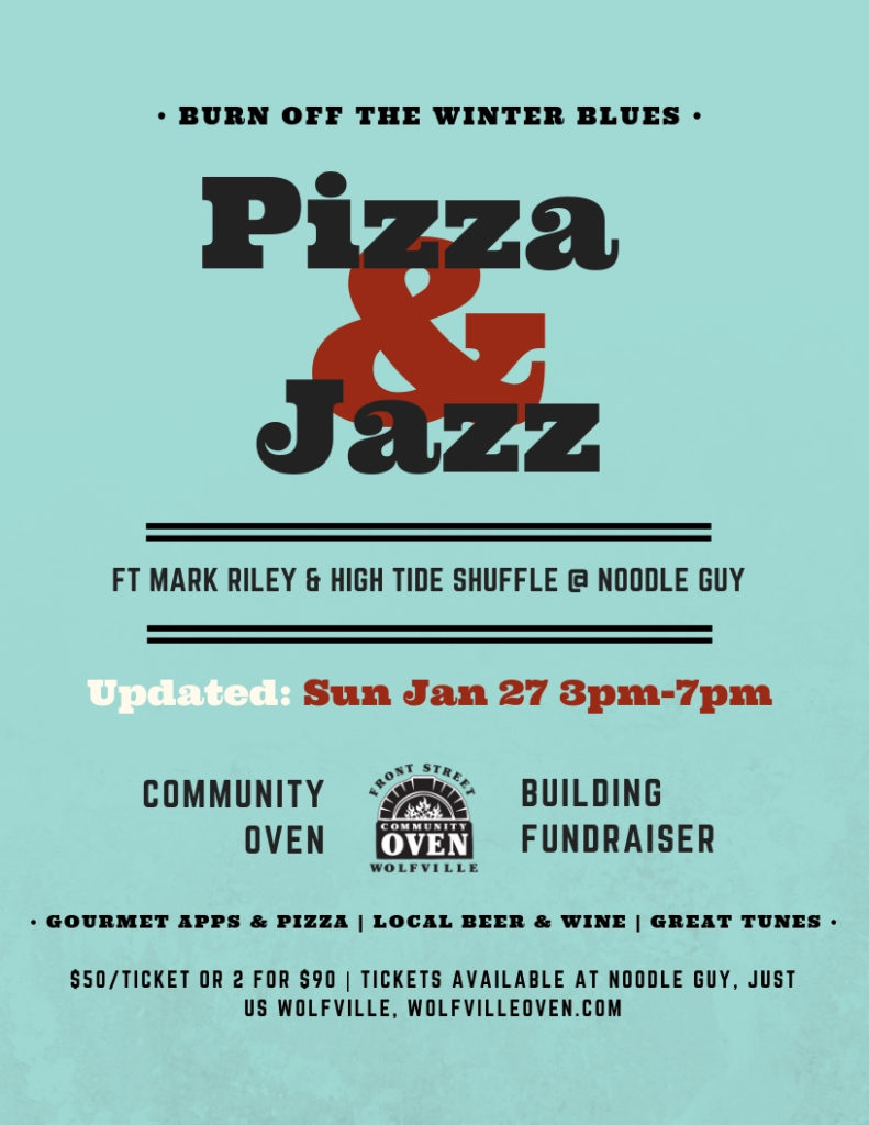 Our amazing team is so excited to host our first public fundraiser event for the Front St Community Oven in Wolfville. Please join us for pizza and jazz at the The Noodle Guy. Now on January 27th, 2019 from 3pm-7pm. The evening will include topping your pizza with gourmet toppings provided by amazing artisanal producers and Ross the Noodle Guy, gourmet appetizers, a surprise visual installation, local alcoholic and non-alcoholic beverages TBA, and jazzy and danceable tunes by Mark Riley and the High Tide Shuffle.